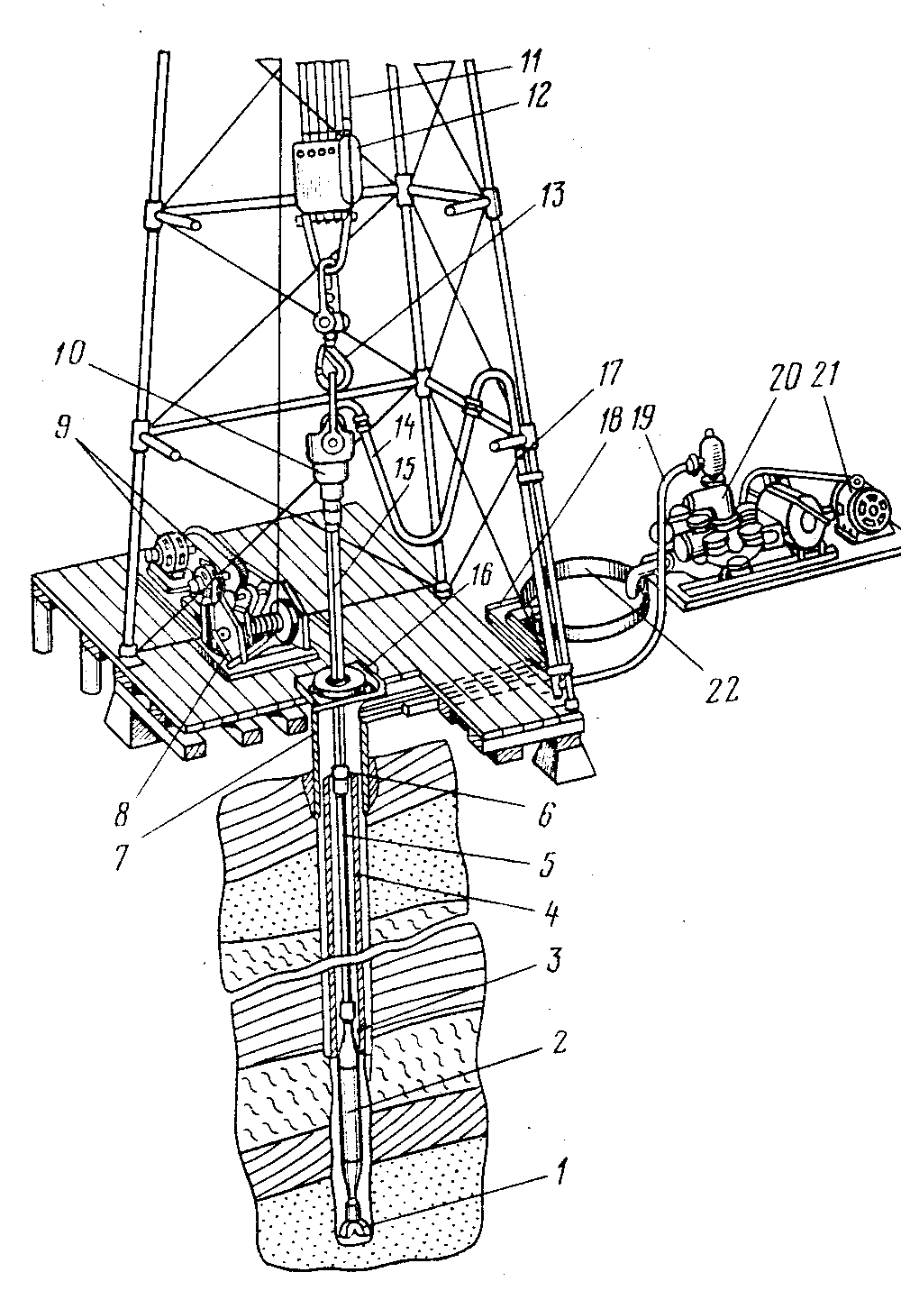 При бурении с забойным двигателем долото 1 привинчено к валу, а бурильная колонна – к корпусу двигателя 2. При работе двигателя вращается его вал с долотом, а бурильная колонна воспринимает реактивный момент вращения корпуса двигателя, который гасится невращающимся ротором (в ротор устанавливают специальную заглушку). Буровой насос 20, приводящийся в работу от двигателя 21, нагнетает буровой раствор по манифольду (трубопроводу высокого давления) 19 в стояк - трубу 17, вертикально установленную в правом углу вышки, далее в гибкий буровой шланг (рукав) 14, вертлюг 10 и в бурильную колонну. Дойдя до долота, промывочная жидкость проходит через имеющиеся в нем отверстия и по кольцевому пространству между стенкой скважины и бурильной колонной поднимается на поверхность. Здесь в системе емкостей 18 и очистительных механизмах (на рисунке не показаны) буровой раствор очищается от выбуренной породы, затем поступает в приемные емкости 22 буровых насосов и вновь закачивается в скважину. В настоящее время применяют три вида забойных двигателей – турбобур, винтовой двигатель и электробур (последний применяют крайне редко). По мере углубления скважины бурильная колонна, подвешенная к полиспастной системе, состоящей из кронблока (на рисунке не показан), талевого блока 12, крюка 13 и талевого каната11, подается в скважину. Когда ведущая труба 15 войдет в ротор 16 на всю длину, включают лебедку, поднимают бурильную колонну на длину ведущей трубы и подвешивают бурильную колонну с помощью клиньев на столе ротора. Затем отвинчивают ведущую трубу 15 вместе с вертлюгом 10 и спускают ее в шурф (обсадную трубу, заранее установленную в специально пробуренную наклонную скважину) длиной, равной длине ведущей трубы. Скважина под шурф бурится заранее в правом углу вышки примерно на середине расстояния от центра до ее ноги. После этого бурильную колонну удлиняют (наращивают), путем привинчивания к ней двухтрубной или трехтрубной свечи (двух или трех свинченных между собой бурильных труб), снимают ее с клиньев, спускают в скважину на длину свечи, подвешивают с помощью клиньев на стол ротора, поднимают из шурфа ведущую трубу с вертлюгом, привинчивают ее к бурильной колонне, освобождают бурильную колонну от клиньев, доводят долото до забоя и продолжают бурение. Таким образом процесс работы долота на забое скважины прерывается наращиванием бурильной колонны и спуско-подъемными операциями (СПО)для смены изношенного долота. К окну в трубе приваривают короткий металлический желоб, по которому в процессе бурения буровой раствор направляется в систему емкостей 18 и далее, пройдя через очистительные механизмы (на рисунке не показаны), поступает в приемную емкость 22 буровых насосов. Трубу (колонну труб) 7, установленную в шурфе, называют направлением. Установка направления и ряд других работ, выполняемых до начала бурения, относятся к подготовительным. После их выполнения составляют акт о вводе в эксплуатацию буровой установки и приступают к бурению скважины. Пробурив неустойчивые, мягкие, трещиноватые и кавернозные породы, осложняющие процесс бурения (обычно 400-800 м), перекрывают эти горизонты кондуктором 4 и цементируют затрубное пространство 3 до устья. При дальнейшем углублении могут встретиться горизонты, также подлежащие изоляции, такие горизонты перекрываются проме