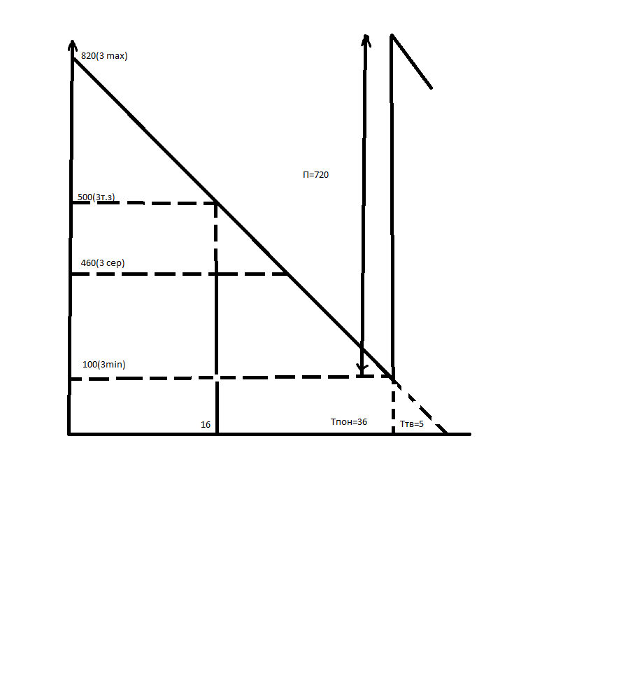 2.визначемо мінімальний (страховий) запас інструменту Зmin=Д∙Тт-в шт./день,при цьому денна потреба в фрезах становить; Д=П:Тпон=720:36дн=20шт. Звідси Зmin=20∙5=100шт. 3.Визначемо максимальний запас інструменту Зmax= Зmin+П=100+720=820шт. 4.Визначимо середній запас інструменту. Зсер=Зmin+0.5П=100+0.5∙720=460шт. 5.Визначимо запас точки замовлення. Зт.з=Зmin+Д∙Тн-в=100+20∙20=500шт. 6.Покажемо розв’язання задачі графічно