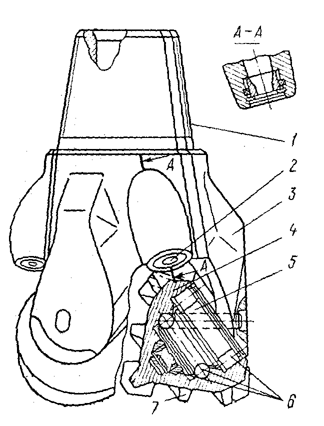 Шарошечные долота изготавливают как с центральной, так и с боковой системой промывки (рис. 3.5.). На лапах долота с боковой гидромониторной системой промывки выполнены специальные утолщения – приливы 2 с промывочными каналами и гнездами для установки гидромониторных насадок (сечение А-А). При центральной промывке забоя лучше очищаются от шлама центр забоя и вершины шарошек, шлам беспрепятственно выносится в наддолотную зону. Однако при высокой скорости углубки забоя трудно подвести к долоту необходимую гидравлическую мощность, требуемую для качественной очистки забоя (перепад давления на долотах с центральной промывкой не превышает 0,5-1,5 МПа). Боковая гидромониторная промывка обеспечивает лучшую очистку наиболее зашламованной периферийной части забоя, позволяет подвести к долоту большую гидравлическую мощность (перепад давления на долотах с гидромониторной промывкой достигает 5-15 МПа). Однако мощные струи бурового раствора, выходящие из гидромониторных насадок экранируют транспортирование шлама через проемы между секциями долота, поэтому часть шлама циркулирует некоторое время в зоне действия шарошек и переизмельчается, а часть – транспортируется в зазорах между стенкой скважины и спинками лап. Поэтому зачастую переходят на ассиметричную систему промывки, заглушая одну или две гидромониторные насадки для повышения пропускной способности основных транспортных