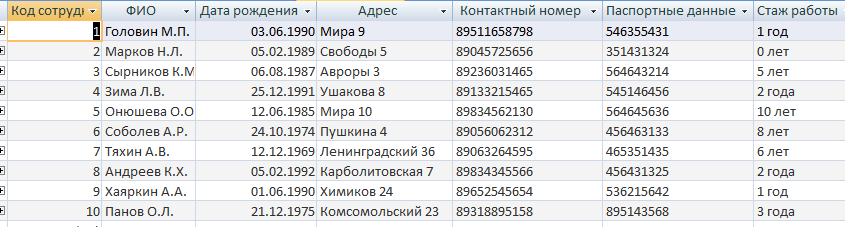 Рисунок В.5 – Таблица «Сотрудники»