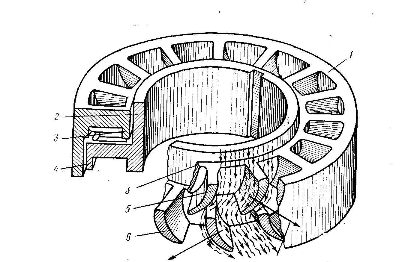 Частота вращения ротора турбины n от изменения плотности r не зависит. Параметры характеристики турбины изменяются также пропорционально изменению числа ступеней. ГОСТ 26673 предусматривает изготовление бесшпиндельных (ТБ) и шпиндельных (ТШ) турбобуров. Турбобуры ТБ применяются при бурении вертикальных и наклонных скважин малой и средней глубины без гидромониторных долот. Применение гидромониторных долот невозможно по тем причинам, что через нижнюю радиальную опору (ниппель) даже при незначительном перепаде давления протекает 10 – 25% бурового раствора. Значительное снижение потерь бурового раствора достигается в турбобурах, нижняя секция которых, названная шпинделем, укомплектована многорядной осевой опорой и радиальными опорами, а турбин не имеет. Присоединяется секция шпиндель к одной (при бурении неглубоких скважин), двум или трём последовательно соединённым турбинным секциям. Поток бурового раствора, пройдя турбинные секции, поступает в секцию – шпиндель, где основная его часть направляется во внутрь вала шпинделя и далее к долоту, а незначительная часть – к опорам шпинделя, смазывая трущиеся поверхности дисков пяты и подпятников, втулок средних опор и средних опор. Благодаря непроточной конструкции опор и наличию уплотнений вала, значительно уменьшены потери бурового раствора через зазор между валом шпинделя и ниппелем. Для бурения наклонно – направленных скважин разработаны шпиндельные турбобуры – отклонители типа ТО. Турбобур – отклонитель состоит из турбинной секции и укороченного шпинделя. Корпуса турбинной секции и шпинделя соединены кривым переводником. Для бурения с отбором керна предназначены колонковые турбобуры типа КТД, имеющие полый вал, к которому через переводник присоединяется бурильная головка. Внутри полого вала размещается съёмный керноприёмник. Верхняя часть керноприёмника снабжена головкой с буртом для захвата его ловителем, а нижняя – кернорвателем, вмонтированным в переводник. Для выхода бурового раствора, вытесняемого из керноприёмника по мере заполнения его керном, вблизи верхней части керноприёмника имеются радиально расположенные отверстия в его стенке, а несколько ниже их – клапанный узел. Последний предотвращает попадание выбуренной породы внутрь керноприёмника, когда он не заполняется керном, и в это время клапан закрыт. Керноприёмник подвешан на опоре, установленной между переводником к БК и распорной втулкой. Под действием гидравлического усилия, возникающего от перепада давления в турбобуре и долоте, и сил собственного веса, керноприёмник прижимается к опоре и во время работы турбобура не вращается.