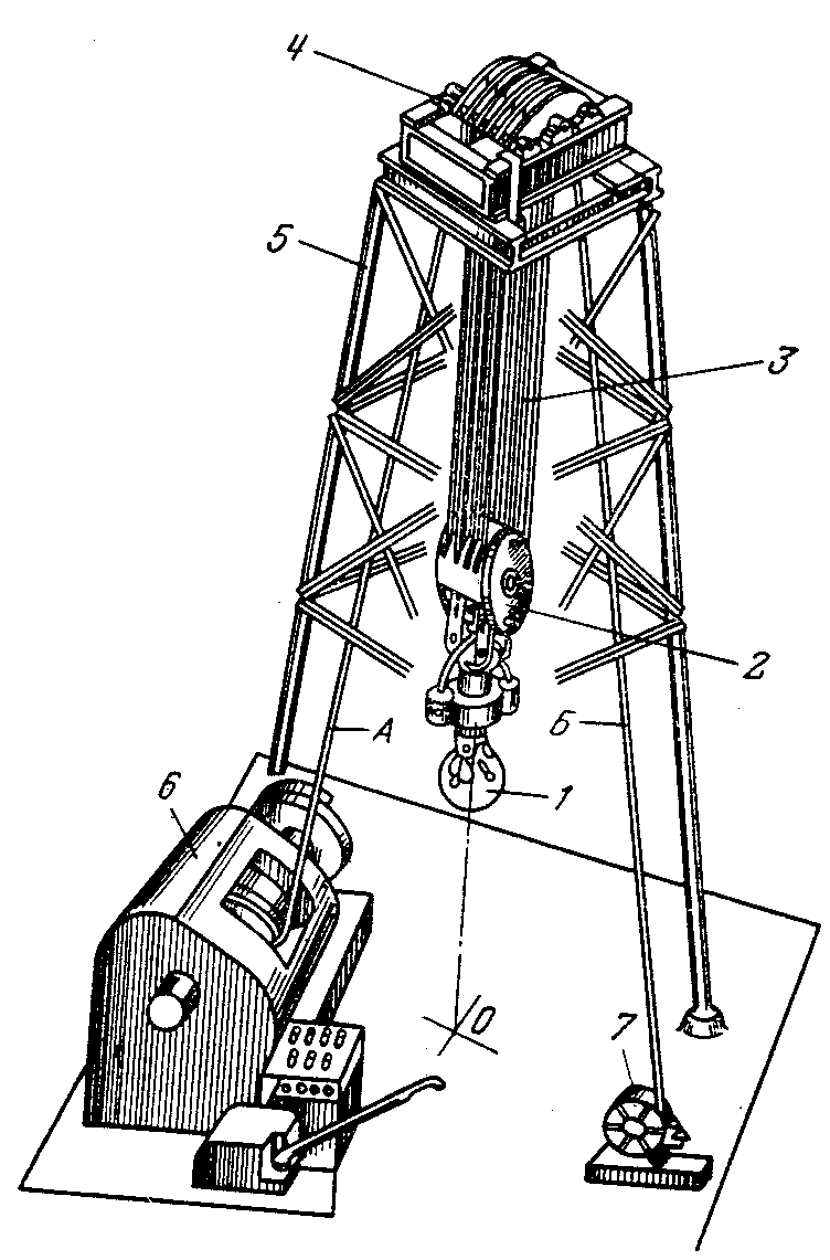 Спускоподъёмный комплекс буровой установки (рис. 4.4.) представляет собой полиспастный механизм, состоящий из кронблока 4, талевого (подвижного) блока 2, стального каната 3, являющегося гибкой связью между буровой лебёдкой 6 и механизмом 7 крепления неподвижного конца каната. Кронблок 4 устанавливается на верхней площадке буровойвышки 5. Подвижный конец А каната 3 крепится к барабану лебедки 6, а неподвижный конец Б – через приспособление 7 к основанию вышки. К талевому блоку присоединяется крюк 1, на котором подвешивается на штропах элеватор для труб или вертлюг. В настоящее время талевый блок и подъёмный крюк объединены в один механизм – крюкоблок.