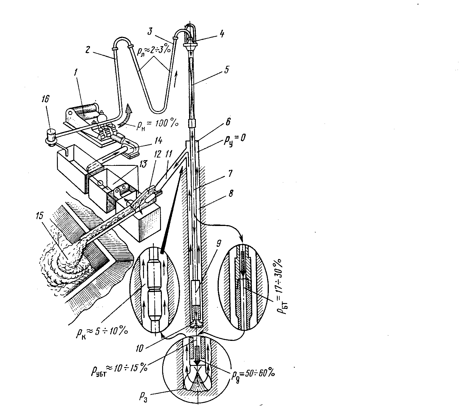 На рис. 4.5 представлен комплекс для вращения бурильной колонны. В его состав входит ротор 2, расположенный на полу буровой 1, вертлюг 6, подвешенный на крюке крюкоблока 8. Вертлюг посредством гибкого бурового рукава 4 и стояка 7 передаёт буровой раствор под давлением в бурильную колонну. Посредством вращателя 2 и квадратной ведущей трубы 3 крутящий момент ротора передаётся бурильной колонне и не передаётся талевой системе. 4.4. Насосно – циркуляционный комплекс буровой установки. На рис. 4.6. показана схема циркуляции бурового раствора и примерное распределение потерь напора в отдельных элементах циркуляционной системы скважины глубиной 3000 м. Из резервуаров 13 очищенный и подготовленный раствор поступает в подпорные насосы 14, которые подают его в буровые насосы 1. Последние перекачивают раствор под высоким давлением (до 30 МПа) по нагнетательной линии, через стояк 2, гибкий рукав 3, вертлюг 4, ведущую трубу 5 к устью скважины 6. Часть давления насосов при этом расходуется на преодоление сопротивлений в наземной системе. Далее буровой раствор проходит по бурильной колонне 7 (бурильным трубам, УБТ и забойному двигателю 9) к долоту 10. На этом пути давление раствора снижается вследствие затрат энергии на преодоление гидравлических сопротивлений. Затем буровой раствор вследствие разности давлений внутри бурильных труб и на забое скважины с большой скоростью выходит из насадок долота, очищая забой и долото от выбуренной породы. Оставшаяся часть энергии раствора затрачивается на подъём выбуренной породы и преодоление сопротивлений в затрубном кольцевом пространстве 8. Поднятый на поверхность к устью 6 отработанный раствор проходит по растворопроводу 11 в блок очистки 12, где из него удаляются в амбар 15 частицы выбуренной породы и поступает в резервуары 13 с устройствами 16 для восстановления его параметров; и снова направляется в подпорные насосы. Нагнетательная линия (манифольд) состоит из трубопровода высокого давления, по которому раствор подаётся от насоса 1 к стояку 2 и гибкому рукаву 3, соединяющему стояк 2 с вертлюгом 4. Манифольд оборудуется задвижками и контрольно – измерительной аппаратурой. Для работы в районах с холодным климатом предусматривается система обогрева трубопроводов.