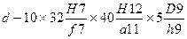 Дано подвижное шлицевое соединение с прямобочным профилем зуба средней серии, воспринимающее значительные нагрузки и обеспечивающее высокую точность центрирования. По наружному диаметру и заданной серии выбираем номинальные параметры шлицевого сопряжения [3]: наружный диаметр D = 40 мм; внутренний диаметр d = 32 мм; число шлицев z = 10; ширина шлица b = 5 мм. Так как шлицевое сопряжение подвижное и воспринимает значительные нагрузи, то твердость поверхности вала и втулки должна быть высокой. Этим требованиям наряду с высокой точностью центрирования отвечает центрирование по внутреннему диаметру. Посадочными поверхностями в данном случае является внутренний диаметр d и ширина шлицев b. Согласно рекомендациям [3] предпочтительными посадками, обеспечивающими подвижность соединения, являются: для d - Ø 32 H7/f7; для b – 5 D9/h9. Для непосадочного наружного диаметра установлена посадка Ø40 H12/a11. Цифровые значения предельных отклонений приведены в тех же таблицах, что и для гладких сопряжений [2]: