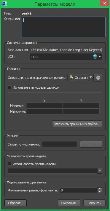 Переходим к вкладке «Управление» - «Параметры модели». В появившемся окне задаем координаты нужного нам участка, либо выделяем его в интерактивном режиме.