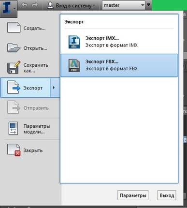 Для сохранения проекта в качестве 3D модели выбираем «Экспорт» - «Экспорт в FBX».