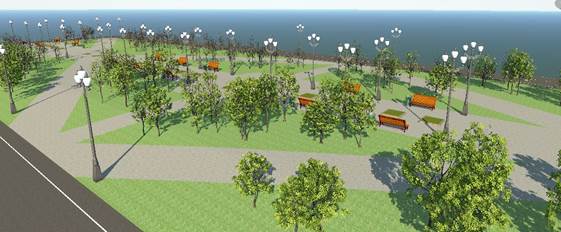 В результате проектирования была разработана модель парка отдыха. Были учтены следующие требования: · Расстояние между деревьями в городских садах и парках при посадках в куртинах и массивах при сомкнутых кронах составляет 3,5 - 5 м, при разомкнутых - 4 - 6 м. · На территории парка (сквера) должны быть оборудованы асфальтовые, брусчатые или иные тротуары (дорожки), соединяющие входы и выходы. · Территория парка (сквера) должна быть оборудована малыми архитектурными формами. · Плотность расстановки скамей – 30-60 штук на 1 га территории сада или парка. · Скамьи и парковые столы устанавливают из разнообразного материала, устойчивого к изменению погодных условий, – из камня, металла, бетона, дерева, пластмассы. · Около стационарных мест отдыха, расположенных на территории парка (сквера), должны быть установлены урны для сбора мусора. · Расставляют урны по кромкам дорожек и площадок на расстоянии не менее 0,8 м от скамей для изоляции от отдыхающих посетителей; · Территория парка (сквера) должна быть оборудована системами наружного освещения. · Осветительное оборудование должно быть пожаробезопасным. · При освещении парковых территорий различаются осветительные установки, выполняющие утилитарные и декоративные функции. Установки утилитарного значения обеспечивают освещение путей передвижения пешеходов. · На аллеях шириной 8-15 м. интервалы между светильниками должны составлять не более 25 м.