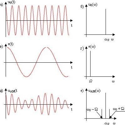 Рис. 2. Амплітудна модуляція а) несучі коливання(несуча хвиля) та її спектр (б); в) модулюючий сигнал та його спектр (г); д) амплітудно-модулюючі коливання та його спектр (е).