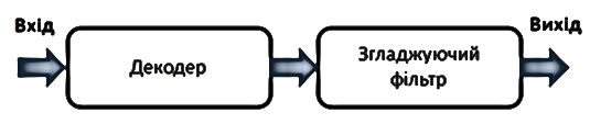 Рис.10. Структурна схема ЦАП. На приймальній стороні лінії зв’язку послідовність імпульсів після демодуляції і регенерації в приймачі надходить до цифро-аналогового перетворювача (ЦАП), що виконує роль зворотного перетворення (відновлення) неперервного повідомлення згідно з отриманою послідовністю кодових комбінацій. В склад ЦАП входять декодуючий пристрой, який призначені для перетворення кодових комбінацій в квантовану послідовність відліків, а також згладжуючий фільтр(ФНЧ), що відновлює неперервне повідомлення по квантовим значенням. б) Визначення частоти дискретизації fд і інтервал дискретизації Тд . Інтервал дискретизації за часом fД ≥ 2Fmax (4.2) Збільшення частоти дискретизації дозволяє спростити вхідний фільтр АЦП, що обмежує спектр первинного сигналу, і вихідний (інтерполюючий) ФНЧ ЦАП, що відновлює неперервний сигнал за його відліками. Але збільшення частоти дискретизації приводить до зменшення тривалості двійкових сигналів на виході АЦП, що вимагає небажаного розширення смуги частот каналу зв’язку для передачі цих символів. Звичайно параметри вхідного ФНЧ АЦП і вихідного ФНЧ ЦАП вибирають однаковими. На рис.11 дані: f1 ≥ Fmax (4.3) Для того, щоб виключити накладання спектрів f2 ≤ (fД - Fmax) (4.4) Щоб ФНЧ не були занадто складними, відношення граничних частот вибирають із умови f2 / f1 = 1,3...1,4 (4.5)