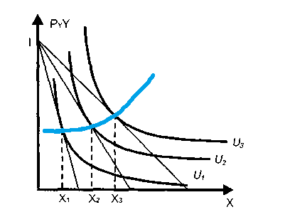 2. Коли змінюється ціна на одне із благ (Х), а доход споживача і ціна іншого блага (У) залишаються постійними, тоді бюджетна лінія буде обертатися навколо точки її перетину з віссю У і щоразу буде торкатися все більш віддалених кривих байдужості. [4, с.37]