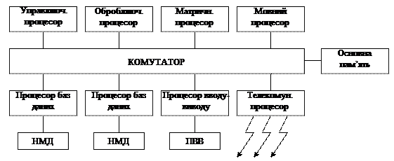 1. Функціональний розподіл системи В ЕОМ перших трьох поколінь всі обчислювальні функції реалізовувались одним процесором і інтерпретувалися ним, як арифметичні та логічні операції. Висока продуктивність системи утворилась на основі багатопроцесорних комплексів. Використання в таких комплексах однотипних процесорів є економічно невигідним, оскільки в кожному процесорі використовується лише та частина ресурсів, яка необхідна для виконання певної операції в певний момент часу. Найбільш економічний спосіб побудови багатопроцесорних систем - це використання спеціалізованих процесорів, орієнтованих на реалізацію певних функцій: обробка скалярних величин, текстів, матрична обробка, ввід-вивід даних. Система складається із сукупності процесорів, що мають індивідуальну та основну пам’ять.