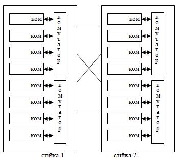 Рис.5. Самі комутатори зв’язані між собою, а також мають по одному порту для розширення системи. Швидкість обміну даними - 8Гб/с. Одним з центральних питань використання архітектури СС VNUMA є різниця в часі звернення. В комп’ютерах HP Superdome є 3 види затримки: процесор і пам’ять знаходяться в одній комірці - затримка мінімальна; процесор і пам’ять знаходяться в різних комірках, під’єднані до одного комутатора - затримка середня; процесор і пам’ять розміщені в різних комірках, комірки під’єднані до різних комутаторів - затримка максимальна. Тому при написанні програми для даного комп’ютера потрібно уникати можливості розпорідного звернення до пам’яті. Також даний комп’ютер має ряд особливостей: він може працювати як єдиний класичний ПК, а можна його скорегувати так, щоб розбити на декілька частин, кожна з яких називається n Portition, вона може працювати під окремою операційною системою; "гаряча" заміна усіх компонентів системи; ефективна робота з великою кількістю периферійних пристроїв; резервування; моніторинг всіх параметрів системи. Розглянемо процесор РА-8700. його тактова частота - 750МГц., володіє суперскалярною архітектурою і витрачає 4 такти на виконання однієї операції. Іншими словами, пікова продуктивність даного процесора - 3 ГФлопс, а всієї 64-процесорної системи - 192 ГФл. Процесор РІ 8700 на кожному такті виконує стільки операцій, скільки йому дозволяє інформаційна структура коду, а також кількість вільних функціональних пристроїв. Всього пристроїв в процесорі є 10.4 з них - для виконання арифметичних операцій над цілими числами; 4 - над дробовими і 2 функціональні пристрої - для проведення запису/читання. Починаючи з процесорів РІ 8500, кеш І рівня розміщується на кристалі процесора і досягає об’єму 2,25 Мб. При складанні програм для комп’ютерів даного класу можуть виникнути проблеми, що характерні для усіх типів паралельних комп’ютерів. А саме, неможливість розпаралелення фрагментів коду, тобто, якщо 25% коду - це послідовні операції, то збільшення швидкодії більш ніж у 5 разів досягнути нереально. Також потрібно звертати увагу на неоднорідність звернень до пам’яті.
