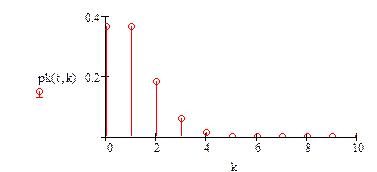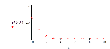 Математическое ожидание показывает, что за это время (время равное математическому ожиданию) наиболее вероятно поступление одного вызова, что видно из второго графика. За время меньшее математического ожидания наибольшую вероятность имеет случай не поступления ни одного вызова (график 1). А за время равное
