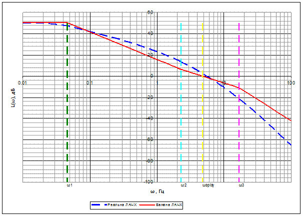 Для підвищення точності роботи системи побудуємо бажану і реальну ЛАЧХ. Бажана ЛАЧХ реалізує ідеальну модель роботи системи,виходячи із відомих постійних часу і частоти зрізу. Реальна ЛАЧХ реалізує реальну роботу системи. Для побудови точної ЛАЧХ реальної системи запишемо вираз для комплексної передаточної функції: