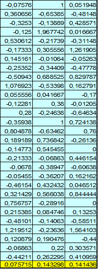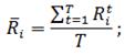 Ri-поточна прибутковість акції; Pi-поточна вартість акції; Pi-1 - вартість акції в попередньому періоді. І аналогічно розраховуємо прибутковості всіх акцій. Наступним етапом, для кожної акції розрахуємо середнє значення прибутковості за весь місяць, тобто за всі тимчасові відрізки. Формула для розрахунку наступна: