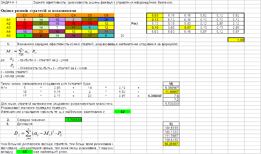 ВИСНОВКИ В ході виконання курсової роботи мною було розглянуто та опрацьовано основні оптимальні показники діяльності структурного підрозділу ДСНС України. Під час роботи основну увагу булу приділено таким типам задач як: оцінка ефективності і ризикованості рішень фахівця ІБ, визначення оптимального плану засобами стохастичного програмування, фінансові ризики та оцінка ступеня ризику, застосування теорії графів в ІБ. На основі розглянутого матеріалу можна зробити висновки, що при вирішенні складних завдань з багатьма факторами, для вибору оптимального рішення використовується математичне моделювання. У цьому випадку за допомогою математичної моделі відбирається серед безлічі єдиний варіант, виходячи з залежностей, закладених в алгоритмі, і прийнятого критерію оцінки ефективності. Експерт має критично оцінити практичний сенс пропонованого варіанту, врахувати вплив соціальних,психологічних та інших факторів, не врахованих в моделі. Прийняття управлінських рішень передбачає формування певного уявлення про систему управління і процесів, що в ній відбуваються. Основним інструментальним методом такого формування є метод моделювання – спосіб теоретичних і практичних дій, спрямованих на створення і використання образу реального об’єкта (моделі), що відбиває основні властивості об’єкта. Практичні завдання економіко-математичного моделювання містять: аналіз економічних об’єктів і процесів, прогнозування розвитку економічних процесів, прийняття управлінських рішень на всіх рівнях ієрархії управління. ВИКОРИСТАНА ЛІТЕРАТУРА 1 Основні підходи до моделювання інформаційної безпеки. [Електронний ресурс]. – Режим доступу: http://intkonf.org/shikova-om-osnovni-pidhodi-do-modelyuvannya-informatsiynoyi-bezpeki/ 2 Среднее арифметическое. [Электронный ресурс]. – Режим доступа: http://ru.wikipedia.org/wiki/ 3 Методи стохастичного факторного аналізу. [Електронний ресурс]. – Режим доступу: http://pidruchniki.ws/18540516/ekonomika/metodi_stohastichnogo_faktornogo_analizu 4 Показники варіації та способи їх обчислення. [Електронний ресурс]. – Режим доступу: http://uristinfo.net/uchebnye-materialy/282-pravova-statistika-vv-golina/8867-rozdil-viii-seredni-velichini-ta-pokazniki-variatsiyi.html?start=2 5 Ризики в оцінці доцільності капіталовкладень. [Електронний ресурс]. – Режим доступу: http://fin-admin.com/faqvu.php?id=18 6 Аналіз сценаріїв проекту. [Електронний ресурс]. – Режим доступу:http://studentbooks.com.ua/content/view/1320/42/1/4/ 7 Показники варіації та способи їх обчислення. [Електронний ресурс]. – Режим доступу: http://uristinfo.net/uchebnye-materialy/282-pravova-s.. 8 Коваріація | Covariance. [Електронний ресурс]. – Режим доступу:http://allfi.biz/financialmanagement/RiskAndReturns/k.. 9 Федоренко І. К. Методи та моделі в управлінні інформаційною безпекою в економіці [Текст]: підручник / І. К. Федоренко (ред.), О. І. Черняк (ред.), О. О. Карагодова, Г. О. Чорноус [та ін.] — К.: Знання, 2007. — 558с. 10 Эффективний портфель по Марковіцу. [Електронний ресурс]. – Режим доступу: http://traderobots.ru/lab/stocks/43-efportfolio 11 Математична статистика - Руденко В.М. Регресія. [Електронний ресурс]. – Режим доступу: http://pidruchniki.ws/15800119/statistika/regresiya 12 Побудова мінімального остовного дерева графа. [Електронний ресурс]. – Режим доступу: http://ukrefs.com.ua/131607-Postroenie-minimal-nogo-ostovnogo-dereva-grafa-metodom-Prima.html 13 Сітьове планування та керування. [Електронний ресурс]. – Режим доступу: http://bokov.net.ua.html