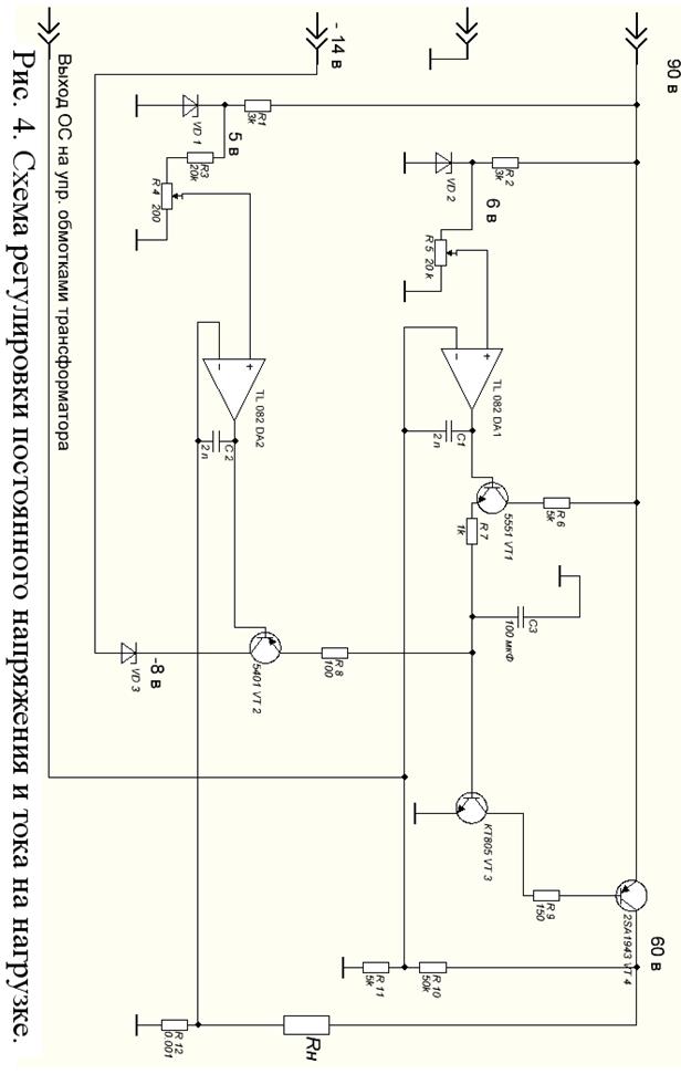 Схема (см. рис. 5), позволяет уменьшить максимальную рассеиваемую мощность на транзисторах с 350 до 120 ватт. Через обратную связь она следит за уровнем напряжения на нагрузке и подключает обмотки трансформатора через реле. В данной схеме реализованы два основных правила: 1. Переключение с одной обмотки на другую должно осуществляться в устойчивое положение. Для этого использованы триггеры Шмитта, реализованных на ОУ с положительной обратной связью. 2. Переключение обмоток должно осуществляться так, чтобы избежать одновременного подключения более одного реле. Для этого эмиттеры управляющих транзисторов приподняты относительно отрицательного потенциала -14 на 5 вольт, это позволяет использовать строгую очередность на переключение реле, а задержка определяется RC цепочкой на выходе соответствующего ОУ.