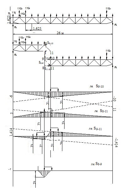 Рисунок 2.3.– Лінії впливу для чотирьох стержнів заданої панелі ферми.