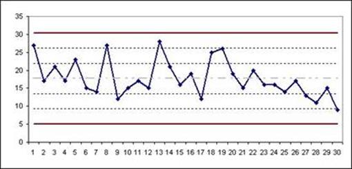 Комментарии. Контрольные границы вычисляются как 3 стандартных отклонения от среднего значения данных. 6. На карте отобразите CL, UCL и LCL как линии параллельные оси x. 7. Подобно нижней и верхней границам, посчитайте и отобразите пределы первого и второго сигма уровней. Пределы первого сигма уровня – одно отклонение от среднего. Пределы второго сигма уровня – два отклонения от среднего. Пределы третьего сигма уровня они же контрольные границы – три отклонения от среднего