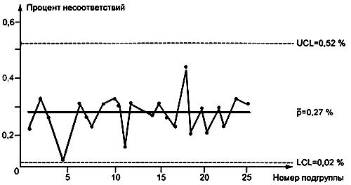Пример p-карты. В таблице 6 указано число несоответствующих единиц в час с учетом неисправностей, найденных при сплошном контроле небольших выключателей с помощью устройств автоматического контроля. Выключатели производят на автоматической сборочной линии. Поскольку неисправность серьезна, для определения момента выхода сборочной линии из статистически управляемого состояния используют контрольную карту процента несоответствующих единиц. Карта получена при сборе предварительных данных по 25подгруппам каждая из 4000 выключателей (таблица 6).