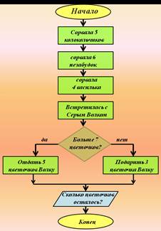 1. Составь блок-схему алгоритма для решения задач. Клоун Вася показывал фокусы: сначала из шляпы он достал 3 кроликов, потом 5 цветных платочков, затем 8 разноцветных шариков и, наконец, 4 попугаев. Сколько животных и предметов всего клоун Вася достал из шляпы?