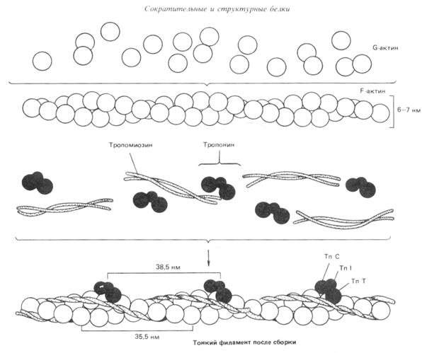 Схема тонкого филамента. Показана пространственная конфигурация трех главных белковых компонентов: актина, тропомиозина и тропонина (по Р. Марри, 1993).