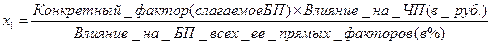 Методика формализованного расчета факторных влияний на прибыль от реализации продукции, разработанная А.Д. Шереметом, состоит в следующем. 1) Сначала осуществляется расчет общего изменения прибыли (ΔП) от реализации продукции: ΔП=П1-П0, где: П1 и П0 — прибыль соответственно отчетного и базисного периодов. 2) Далее рассчитывается влияние на прибыль изменений отпускных цен на реализованную продукцию (ΔП1): ΔП1=∑p1q1–∑p0q1, где: р - цена изделия; q - количество изделий; ∑p1q1, ∑p0q1 — реализация в отчетном году в ценах, соответственно, отчетного и базисного периодов. 3) На следующем этапе рассчитывается влияние на прибыль изменений в объеме продукции (ΔП2): ΔП2=П0 К1-П0=П0(К1-1), где: К1 - коэффициент роста объема реализации продукции: К1 4) Далее рассчитывается влияние на прибыль изменений в объеме продукции, обусловленных изменениями в структуре продукции (ΔП3): ΔП3=П0(К2–К1), где: К2— коэффициент роста объема продаж в оценке по отпускным ценам: К2=Р1,0/Р0 , где: Р1,0 — реализация в отчетном периоде по ценам базисного периода; Р0 — реализация в базисном периоде. 5) Далее оценивается влияние на прибыль экономии от снижения себестоимости продукции (ΔП4): ΔП4=С1,0–С1, где: С1,0 — себестоимость продаж продукции отчетного периода в ценах и условиях базисного периода; С1 — фактическая себестоимость проданной продукции отчетного периода. 6) На последнем этапе осуществляется расчет влияния на прибыль изменений себестоимости за счет структурных сдвигов в составе продукции (ΔП5): ΔП5=С0К2-С1,0 Отдельным расчетом по данным бухгалтерского учета определяется влияние на прибыль изменений цен на материалы и тарифов на услуги (ΔП6), а также экономии, вызванной нарушениями хозяйственной дисциплины (ΔП7). Сумма факторных отклонений дает общее изменение прибыли от продаж за отчетный период, что выражается следующей формулой: ΔП=П1-П0=ΔП1+ΔП2+ΔП3+ΔП4+ΔП5+ΔП6+ΔП7 или ΔП=∑ΔПi, Факторный анализ чистой прибыли. Чистая прибыль - это часть бухгалтерской прибыли, остающаяся в распоряжении коммерческой организации после начисления текущего налога на прибыль (ТНП), а также с учетом отложенных налоговых активов (ОНА) и отложенных налоговых обязательств (ОНО), т.е. в соответствии с ПБУ 18/02 «Учет расчетов по налогу на прибыль» (по форме № 2: стр. 190 = стр. 140 + стр. 141 - стр. 142 - стр. 150). Она отражена в форме № 2 по стр. 190. Чистая прибыль определяется по формуле: ПЧ=ПБ+ОНА-ОНО-ТНП Факторный анализ чистой прибыли позволяет ответить на вопрос о том, по каким причинам сумма чистой прибыли отличается от суммы бухгалтерской прибыли. Перечень факторов, обусловливающих изменение чистой прибыли, определяется самой методикой ее расчета: 1) сумма бухгалтерской прибыли; 2) сумма текущего налога на прибыль; 3) изменение суммы отложенных налоговых активов за отчетный период (по счету 09); 4) изменение суммы отложенных налоговых обязательств за отчетный период (по счету 07). Поскольку чистая прибыль является частью бухгалтерской прибыли, то влияние на ЧП факторов, обусловивших изменение БП, можно рассчитать методом пропорции: Влияние на БП всех ее прямых факторов (в %) – Влияние на ЧП (в руб.) Конкретный фактор (слагаемое БП) – х1 Отсюда: