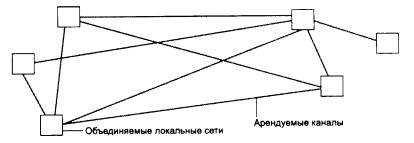 Рис.6.4. Использование выделенных каналов Именно второй способ использования глобальных каналов получил специальное название «услуги выделенных каналов», так как в нем действительно больше ничего из технологий собственно глобальных сетей с коммутацией пакетов не используется. Выделенные каналы очень активно применялись совсем в недалеком прошлом и применяются сегодня, особенно при построении ответственных магистральных связей между крупными локальными сетями, так как эта услуга гарантирует пропускную способность арендуемого канала. Однако при большом количестве географически удаленных точек и интенсивном смешанном трафике между ними использование этой службы приводит к высоким затратам за счет большого количества арендуемых каналов. Сегодня существует большой выбор выделенных каналов - от аналоговых каналов тональной частоты с полосой пропускания 3,1 кГц до цифровых каналов технологии SDH с пропускной способностью 155 и 622 Мбит/с.