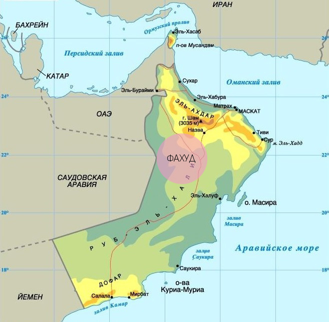 ОБЩАЯ И ГЕОЛОГИЧЕСКАЯ ХАРАКТЕРИСТИКА Месторождение Фахуд в административном отношении расположено на территории округов Дахилия и Захира в Республике Оман. В геоморфологическом отношении район работ находится на полуострове, окруженном Оманским и Персидским заливами, а также Аравийским морем. Рельеф участка слабо всхолмленный, незаболоченный. Большая часть месторождения находится в зоне сухого тропического климата. Внутренние пустынные районы имеют среднюю температуру летом около плюс 32ºС, зимой в районе плюс 27-29ºС, при этом влажность воздуха доходит до 96%. При этом ночью в зимнее время температура может опускаться до нулевой отметки. Осадков выпадает не более 100 мм в год. Климат характеризуется долгими засушливыми периодами без дождей. Наименьшая среднегодовая температура наиболее холодного месяца (январь) плюс 25.8 °С., самого тёплого (июнь) плюс 37 °С. Абсолютный минимум температуры плюс 22 град. С, абсолютный максимум плюс 57 град. С, среднегодовая температура плюс 32 град. С, а среднее годовое количество осадков не превышает 100 мм. Проведение работ осложняется пустынными суховеями, которые приносит сухой антициклон со стороны Бахрейна. Редкие дожди - результат перемещения охлажденного воздуха с Средиземного моря через Объединенное Арабские Эмираты к северной и центральной части Республики Оман. В период с июня по сентябрь здесь, а также в южных районах дуют муссоны "Хариф" с Индийского океана, что приносит обильные осадки. Преобладающие направление ветра зимой юго-западное – западное, летом северное – северо-восточное, наибольшая скорость ветра 22 м/с. Географическое расположение района работ представлено на рисунке1.