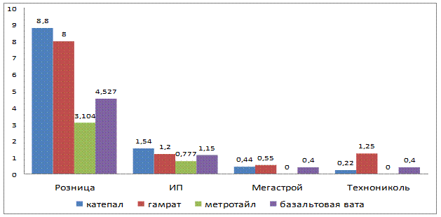 Из рис 2.5 видно, что компания «Мир кровли и фасада» четко ориентирована на розничных клиентов, так как доля покупок товаров среди организаций незначительна. Среди розничных покупателей спросом пользуются вся продукция, предлагаемая фирмой, а крупные организации тяготеют к приобретению определенного вида материалов. Это вызвано самим характером деятельности организаций, их закупки у «Мир кровли и фасада» осуществляются преимущественно с целью дальнейшей перепродажи.
