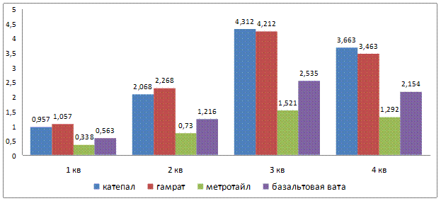 Рис.2.6 Объем продаж материалов по кварталам за 2014 год (в млн.руб.)