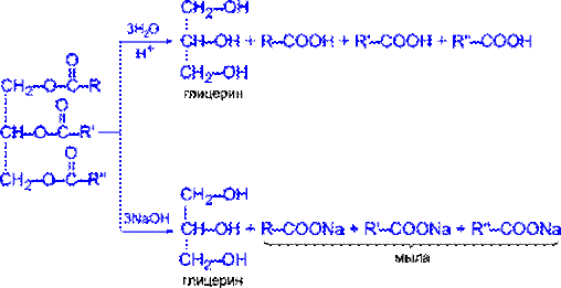 1. Гидролиз (омыление) жиров в кислой или в щелочной среде, или под действием ферментов: а) кислотный гидролиз: под действием кислоты жиры гидролизуются до глицерина и карбоновых кислот, которых входили в молекулу жира. б) щелочной гидролиз – омыление. Получается глицерин и СОЛИ карбоновых кислот, входивших в состав жира.