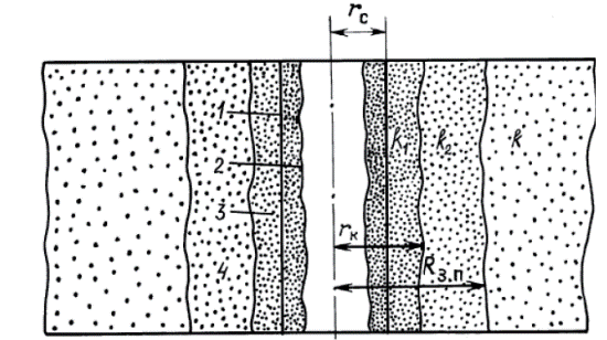 Рисунок 5 - Схемы прискважинной зоны пласта после вскрытия его бурением. 1 - стенка скважины; 2 - глинистая корка; 3 - зона кольматации; 4 - зона проникновения фильтрата промывочной жидкости; k. k1, k2 - проницаемости, соответственно, начальная, в зоне кольматации и в зоне проникновения фильтрата.