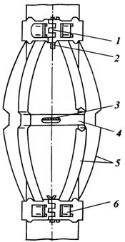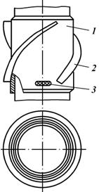 Турбулизаторы типа ЦТ предназначены для завихрения восходящего потока тампонажного раствора в затрубном пространстве скважины при цементировании. Как правило, их размещают против зон расширения ствола скважины на расстоянии не более 3 м друг от друга. Турбулизатор состоит из неразъемного корпуса 1 и лопастей 2. Лопасти устанавливаются в пазы, прорезанные в корпусе под углом 350, и крепятся к корпусу металлическими накладками с помощью точечной сварки. Лопасти могут быть металлическими или резинокордными. На обсадной трубе турбулизатор крепят с помощью спирального клина 3, забиваемого в кольцевую канавку и отверстие, выполненные в утолщенной части корпуса.
