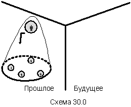 Принцип: в стратагеме есть две мета-конструкции: во-первых, стратагема осуществляется в несколько временных шагов (как минимум, в два шага). Поэтому в схеме должно быть разделение на пространства прошлого и будущего. Во-вторых, в стратагеме герой создает свой фокус управления над объектом, ранее находящимся под управлением врага. Для этого используем схематизм, аналогичный схеме стратагемы 23 «Дружить с дальним, воевать с ближним».