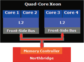 В двухъядерных процессорах этих двух производителей реализованы совершенно непохожие архитектуры. В устройствах Intel используется технология с разделяемой системной шиной, обеспечивающая каждый процессор половиной запаса мощности системной шины. При работе памяти и выполнении операций доступа к системе ввода/вывода тоже используется ресурс системной шины, так что быстродействие шины становится решающим фактором, определяющим общую производительность системы. При изготовлении последней двухъядерной модели процессора Intel Core 2 Duo используется технологический процесс 65 нм. В устройствах Core 2 Duo и Core 2 Extreme оба ядра располагаются на одной полупроводниковой пластине. Каждое ядро имеет выделенный кэш первого уровня емкостью 64 Кбайт, который состоит из кэша инструкций на 32 Кбайт и кэша данных на 32 Кбайт. Кроме того, оба ядра совместно используют кэш второго уровня емкостью 4 Мбайт. Модель Core 2 Duo обеспечивает обработку в течение одного такта 128-разрядных инструкций SSE (Streaming Single-Instruction, Multiple-Data Extensions), которые используются в сложных математических расчетах и при построении графических изображений. Кроме того, она имеет новую энергосберегающую структуру и системную шину, функционирующую с тактовой частотой 1066 МГц. Структура двухъядерных процессоров, выпускаемых компанией AMD, совершенно иная. В соответствии с принятой в AMD архитектурой Direct Connect Architecture, каждый процессор имеет встроенный контроллер памяти. Шина HyperTransport обеспечивает непосредственную передачу данных между процессорами, системой ввода/вывода и памятью со скоростью 8 Гбит/с. В феврале 2007 г. AMD выпустила новые двухъядерные процессоры Opteron с более высокими тактовыми частотами — до 2,8 ГГц — и более высокой, чем у предшествующих моделей, энергоэффективностью. До конца 2007 г. компания доведет тактовую частоту своих двухъядерных процессоров до 3 ГГц. Двухъядерные процессоры оказались удачным решением и получили широкое распространение. Сегодня эти процессоры, отличающиеся высоким быстродействием и эффективными средствами энергосбережения, установлены почти на всех серверах и на многих настольных системах пользователей. Следуя тому же сценарию, который привел к появлению двухъядерных устройств, Intel и AMD перешли от двухъядерной технологии процессоров к четырехъядерной. Выпустив в ноябре 2006 г. модель Quad-Core Intel Xeon processor 5300 series, Intel стала лидером в этой области. Четырехъядерный процессор Intel представляет собой два двухъядерных процессора, размещенных на одном кристалле. Иными словами, разработанное специалистами Intel четырехъядерное устройство Xeon представляет собой не собственно четырехъядерный процессор, а сдвоенный двухъядерный процессор. Но хотя такая архитектура позволила компании Intel быстро довести изделие до рынка, предложенная структура не является оптимальной. Когда процессоры, размещенные на отдельных ядрах, обмениваются данными, эти данные приходится пересылать по системной шине и через контроллер памяти, а это не самый эффективный способ. Кроме того, как и в более ранних структурах Intel, при подобном подходе общее быстродействие системы ставится в зависимость от быстродействия системной шины. Но, несмотря на указанные недостатки и благодаря усовершенствованиям в микроархитектуре Intel Core, а также подключению дополнительных процессоров, четырехъядерные криста