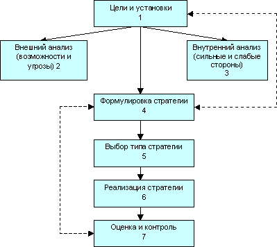 Тщательное изучение сильных и слабых сторон конкурентов и сравнение их результатов с собственными показателями позволят лучше продумать стратегию конкурентной борьбы. К серьезным факторам внешней среды относятся социально-поведенческие и экологические. Фирма должна учитывать также изменения в демографической ситуации, образовательном уровне и др. Например, потребности подготовки кадров для рыночной экономики, переход к которой осуществляется в России, расширяет рынки учебников по менеджменту и маркетингу. Анализ внутренней среды проводится с целью выявления сильных и слабых сторон в деятельности фирмы. Какова общая схема разработки и внедрения инновационной стратегии? Разработка и внедрение стратегии обычно осуществляется по следующей схеме: