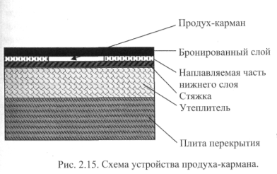 В ряде случаев кровельные материалы целесообразно укладывать, используя, так называемую, частичную приклейку. При этом исключаются условия для появления избыточного давления вследствие образования между кровлей и основанием воздушного зазора, сообщающегося с наружным воздухом по контуру кровли или через специальные вытяжные дефлекторы. Кровли, выполненные таким способом, называются «дышащими» или вентилируемыми. При производстве кровельных работ методом инфракрасного излучения ИК облучения с восстановлением (регенерацией) старого кровельного ковра и укладкой слоя нового бронированного материала создается монолитное покрытие крыши. При этом влага, оставшаяся в утеплителе и перекрытии, при нагревании (в летний период) начинает давить на вновь созданный ковер, в результате чего образуются вздутия (воздушные пузыри). Для устранения этих явлений, а также для просушки утеплителя рекомендуется установка продухов флюгарок из оцинкованной стали или пластиковых дефлекторов (рис. 2.14) из расчета 1 шт на 50 м2. Устройство кровельных машин позволяет создать продух-карман в нижнем слое наплавляемого рулонного материала, с качественной приклейкой боковых поверхностей рулонного полотна (рис. 2.15). Продухи-карманы проходят 1 по всей поверхности крыши и соединены между собой проходами. Для лучшей вентиляции кровли устанавливаются продухи-флюгарки из оцинкованной стали или пластиковые дефлекторы из расчета 1 шт. на 70-100 м². Верхний бронированный слой наплавляется по всей поверхности полотна. Применение вентилируемой кровли с продух-карманами не только позволяет избежать вздутий, но и способствует удалению влаги из материала основания (около 1 кг/м2 за лето).