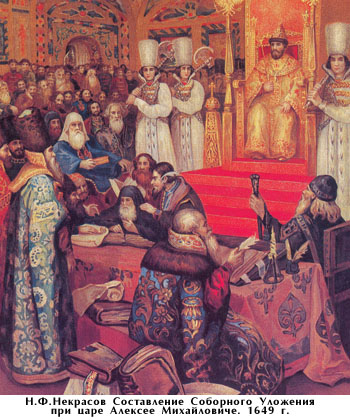 Романовы отстояли независимость страны. Сил воевать с противниками у Михаила не было. Нужно было мириться с теми, с кем это было возможно. Со шведами договориться было нетрудно. Им не нужны были болотистые русские земли на севере страны. Их целью было отрезать Россию от Балтийского моря. В 1617 г. со Швецией был заключен Столбовский мир (деревня Столбово недалеко от Тихвина, современная Ленинградская область). Швеция возвращала Новгород, но оставляла за собой побережье Балтийского моря. Поляки были утомлены долгой войной и пошли на перемирие. В 1618 г. на 14,5 лет было заключено Деулинское перемирие (деревня Деулино близ Троице-Сергиева монастыря). Поляки возвратили русским отца царя митрополита Филарета и других бояр, но оставили за собой Смоленск - важнейшую русскую крепость на западной границе и другие русские города. Таким образом, Россия потеряла значительные территории, но независимость России Романовы отстояли. Романовы покончили с преступностью в стране, применив самые жестокие меры. Так, большую опасность для царя Михаила Федоровича представляли отряды казаков атамана Ивана Заруцкого. К нему перебралась Марина Мнишек после гибели Лжедмитрия II. Марина Мнишек была русской царицей, и ее сын от Тушинского вора - "воренок" - был законным претендентом на русский престол. Отряд И. Заруцкого бродил по стране и не признавал Михаила Романова царем. Романовы стали преследовать И. Заруцкого. Яицкие казаки выдали И. Заруцкого и Марину Мнишек московским властям. И. Заруцкий и 3-летний Иван - "воренок" - были повешены в Москве, а Марина Мнишек заточена в Коломне, где и умерла. Романовы наполнили государственную казну: · они обложили налогом новые категории населения; · правительство пускалось в откровенные финансовые авантюры - резко повышало цены на соль (соль была важнейшим консервантом, население закупало ее в больших количествах), чеканили медную монету вместо серебряной; · брали взаймы у крупных монастырей и не возвращали долгов; · активно осваивали Сибирь - 1/3 всех доходов приносила казне продажа за границу сибирской пушнины. Эти основные меры позволили Романовым вывести страну из глубочайшего политического и экономического кризиса. Последствия Смуты Романовы смогли преодолеть за 30 лет. В правление первых Романовых произошли важнейшие события русской истории: принятие Судебника 1649 г., церковные реформы патриарха Никона 1653 г., воссоединение Украины с Россией 1654 г. Принятие "Соборного уложения" 1649 г. В правление Алексея Михайловича на Земском соборе 1649 г. было принято "Соборное уложение" состояло из 25 глав и содержало около 1000 статей. "Уложение" было впервые отпечатано типографским способом тиражом в 2000 экземпляров. В "Уложении" наиболее важными были три группы глав. 1. В одной группе глав говорилось о преступлениях против царской власти и против Церкви. Любая критика Церкви и хула на Бога карались сожжением на костре, измена царю, оскорбление чести государя, а также бояр, воевод - казнью. Это свидетельствовало о том, что в России фактически сложилась абсолютная монархия - неограниченной полнотой власти в стране обладал царь. Монархия как форма правления начала складываться в России со времен Ивана III. В 1649 г. она оформилась юридически. 2. Еще одна группа глав была посвящена правам дворян. Отныне по "Уложению" за дворянином признавалось пр