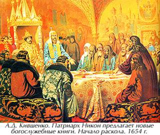 Но реформы вызвали резкий протест части общества - боярства, духовенства, народа. Сторонники старых обрядов - старообрядцы - отказывались признать реформы Никона и призывали вернуться к дореформенным порядкам. Главой старообрядцев стал протопоп Аввакум, во всем похожий на Никона - фанатичный и нетерпимый. Внешне разногласия были незначительны и сводились к тому, по каким образцам - греческим или русским - унифицировать церковные книги; креститься двумя или тремя перстами; как совершать крестный ход - по ходу солнца или против хода солнца и т.д.. Но причина неприятия реформ была более глубокой. Церковные споры в Византии были обычным делом. Византия была наследницей Римской империи. Византийцы впитали культурное наследие Рима. Они привыкли, могли мыслить. У восточных славян культурного наследия не было. У них не было традиции вести богословские споры. Поэтому еще со времен Древней Руси богословская ученость приняла характер беспредельной веры в книгу. Настоящим, истинным, ценным на Руси считалось то, во что верили предки, что было проверено временем, - старина, традиции. Отказ от традиций отцов частью общества был воспринят как отказ от заветов отцов. В это же время на страну обрушились голод и моровая язва. Народ посчитал эти бедствия карой Божьей за отступление от веры предков. Тысячи крестьян, посадских людей бежали на Поморский Север, в Заволжье, на Урал, в Сибирь. Поддержали раскол и представители некоторых знатных боярских фамилий, в частности родственницы первой жены Алексея Михайловича царицы М.И. Милославской боярыня Ф.П. Морозова и ее сестра Е.П. Урусова. Знатных сестер заковали в кандалы, подвергли страшным пыткам, потом сослали в Боровск, где в земляной тюрьме они и умерли. Протопоп Аввакум и его сторонники были сосланы на Cевер в г. Пустозерск. Там в земляной тюрьме в зоне вечной мерзлоты они провели 14 лет. Но от своей веры Аввакум не отрекся. За это он и его единомышленники были сожжены на костре. Патриарх Никон также впал в немилость царя. В 1666 г. на церковном соборе он был смещен с поста патриарха и сослан под Вологду. После смерти Алексея Михайловича Никону было разрешено вернуться из ссылки. В 1681 г. он умер под Ярославлем. Похоронен патриарх-реформатор под Москвой, в Воскресенском Ново-Иерусалимском монастыре, который построен по тому же плану, что и Храм Гроба Господня в Иерусалиме. С тех пор единая Русская Церковь раскололась на две - Русскую Православную Церковь (никонианскую) и Русскую Православную Старообрядческую Церковь.