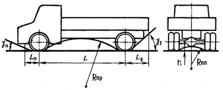 Дорожный просвет (клиренс) h – это расстояние от опорной поверхности до наиболее низшей точки АТС, расположенной между колесами. Передний Ln (задний Lз) свес – расстояние от крайней передней (задней) точки контура АТС до плоскости, проходящей через центры передних (задних) колес перпендикулярно опорной поверхности. Угол переднего γп (заднего γз) свеса – это угол между опорной поверхностью и плоскостью, касательной к колесам и проходящей через нижнюю переднюю (заднюю) точку контура автомобиля. Продольный радиус проходимости Rпр – радиус цилиндрической поверхности, касательной к передним и задним колесам автомобиля и проходящей через нижнюю точку его контура перпендикулярно продольной плоскости. Поперечный радиус проходимости Rпп – радиус цилиндрической поверхности, касательной левому и правому колесу и проходящей через нижнюю точку контура автомобиля, параллельно его продольной плоскости. Определение возможности движения АТС через пороговые нервности различных размеров по вывешиванию и упору представляет собой чисто геометрическую задачу, решаемую сопоставлением размеров неровностей с высотой расположения тех частей автомобиля, которые могут упереться в неровность или вывеситься над ней. Часто к параметрам профильной проходимости дополнительно относят наибольший угол преодолеваемого подъема, наибольший угол преодолеваемого косогора, угол перекоса мостов, коэффициент совпадения следов передних и задних колес. Применительно к автопоездам оценочными показателями профильной проходимости, являются также вертикальный и горизонтальный углы гибкости. К параметрам профильной проходимости полноприводных автомобилей относятся также ширина преодолеваемого в поперечном направлении рва, высота преодолеваемой вертикальной стенки и глубина преодолеваемого брода.
