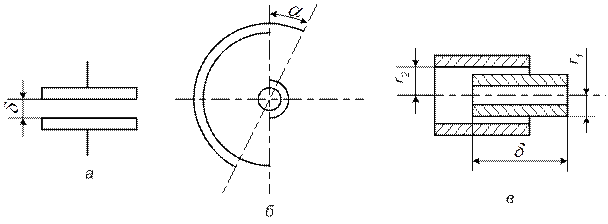 Емкостные датчики с изменяющимся расстоянием между пластинами используют для измерения очень малых перемещений – до 10-6 м. Такая высокая точность достигается включением датчика в плечо мостовой схемы, питаемой напряжением высокой частоты. Емкостной датчик с угловым перемещением а показан на рисунке 8б. Емкость такого конденсатора можно определить по формуле:
