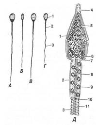 Мал. Будова сперматозоонів: А — бугая; Б — жеребця; В — барана; Г— кнура; Д — ультрамікроскопічна будова голівки і зв'язуючого відділу; 1 — голівка; 2 — зв'язуючий відділ; З — хвостик; 4 — акросома; 5 — ядро; 6 — проксимальна й 7 — дистальна центріолі; 8 — осьова нитка; 9 — мітохондріальна спіраль; 10 — центральне кільце; 11 — товсте волокно На стадії дозрівання відбувається редукція (зменшення) кількості хромосом внаслідок двох поділів мейозом. У результаті першого поділу мейозом з кожного сперматоцита І порядку утворюється два сперматоцити II порядку з гаплоїдним набором хромосом. У результаті другого поділу мейозом із сперматоцитів II порядку утворюється дві сперматиди також з гаплоїдним набором хромосом. Половина утворених сперматид має у своєму ядрі серед гаплоїдного набору хромосом тільки Х-статеву хромосому, друга половина — Y- статеву хромосому. На стадії формування сперматиди перетворюються на зрілі сперматозоони, які зовні вкриваються захисною вуглеводно-білковою оболонкою, набувають однойменного заряду в каналі придатка сім'яника та здатність до самостійного руху. Тривалість сперматогенезу в різних видів тварин неоднакова: у бугая вона дорівнює 62—63 доби, у барана — 47—48, у кнура — 39—40 діб. Кількість і якість сперми, активність у ній сперматозоонів залежать від різних чинників: годівлі, рівня радіації, температури, гіподинамії, гормонів, захворювань, травм. У консервуючих сумішах сперматозоони можуть довго зберігати свою життєздатність. Ця якість сперматозоонів використовується для штучного осіменіння тварин. У деяких дослідах сперма бугая в замороженому стані зберігалася 25 років, барана — 11 років, кнура — 3 роки. Це має значення для збереження генофонду рідкісних видів тварин.