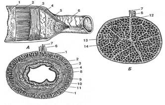 А — трубчастого (вгорі поздовжній, внизу — поперечний розрізи); Б — паренхіматозного; 1 — серозна оболонка; 2 — поздовжній і 3 — кільцевий м'язові шари; 4 — підслизова і 5 — слизова оболонки; 6 — кровоносні судини; 7 — нерв; 8 — слизова оболонка; 9 — її епітеліальне поле; 10 — основа слизової оболонки; 11 — м'язовий шар слизової оболонки; 12 — капсула; 13 — сполучнотканинні трабекули; 14 — паренхіма