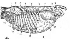 найдовший м'яз (т. longissimus) — тягнеться від крижової і клубової кісток до голови, поділяється на три частини (найдовший м'яз попереку й грудної клітки, найдовший м'яз шиї та найдовший м'яз голови й атланта), у ділянці шиї від найдовшого м'яза відокремлюється особливий м'яз — пластироподібний (т. splenius), який сприяє розгинанню шиї; клубово-реберний м'яз (т. iliocostalis) — тягнеться від клубової кістки до поперечних відростків останніх шийних хребців; Рис. 47. Глибокі м'язи: А — м'язи тулуба корови (за Р. Бароне); Б — плечового поясу й плеча коня; 1 — найдовший м'яз шиї; 2, 4 — клубово-реберний; 3 — дорсальний зубчастий (вдихальний); 5 — дорсальний зубчастий (видихальний); 6 — клубово-реберний; 7 — грудо-поперекова фасція; 8 — пахвинна зв'язка; 9 — клубовий м'яз; 10 — м'язова частина внутрішнього косого м'яза живота; 11 — апоневроз внутрішнього косого м'яза живота; 12 — прямий м'яз живота; 13 — зовнішній міжреберний; 14 — прямий м'яз грудей; 15 — дорсальний і 16 — вентральний драбинчасті; 17 — поверхневий грудний (плечова частина); 18 — глибокий грудний (плечова частина); 19— грудний глибокий (передлопаткова частина); 20— грудниноголовний; 21 — плечопід'язиковий, 22 — пластироподібний; 23, 25 — вентральний зубчастий м'яз грудей; 24 — ромбоподібний остистий і напівостистий м'язи спини й шиї (mm. spinalis et semispinalis dorsi et cervicis) — тягнуться від остистих відростків поперекових і останніх грудних хребців до остистих відростків перших грудних та останніх шийних хребців; багатороздільний м'яз (т. multifidi) — прилягає і закріплюється на остистих відростках грудних хребців. У ділянці хвоста є м'язи — піднімачі хвоста. До вентральної групи м'язів хребта належать довгий м'яз шиї (т. longus colli) — тягнеться під тілами перших шести грудних хребців і до тіл останніх п'яти шийних хребців; довгий м'яз голови (т. longus capitis) — тягнеться від поперечно-реберних відростків другого — п'ятого шийних хребців до потиличної кістки черепа; квадратний м'яз попереку (т. quadratus lumborum) — тягнеться знизу від верхніх кінців останніх ребер і поперечно-реберних відростків перших поперекових хребців до останніх поперекових хребців і крила крижової кістки. Згинає поперек; малий поперековий м'яз (т. psoas minor) — тягнеться від тіл останніх грудних і перших поперекових хребців до клубової кістки поряд з квадратним м'язом попереку. У ділянці хвоста розміщені м'язи — опускачі (згиначі) хвоста.