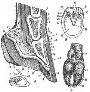 Будова копита. — ungula — складний спеціалізований утвір, розміщений. Разом з пальцевим м'якушем, який входить до його складу, копито забезпечує опору на землю та амортизацію. На копиті розрізняють анатомічно добре виражені чотири ділянки: облямівку, вінець, стінку та підошву. Кожна ділянка складається з епідермісу і власне шкіри.Підшкірна основа є лише в ділянці облямівки й вінця. Копитова облямівка (край)- limbus ungulae — у вигляді вузької (0,5 см), безволосої смужки шкіри міститься на межі шкіри і рогової капсули копита. Ростковий шар епідермісу облямівки продукує тонкий блискучий трубчастий ріг, який зовні вкриває рогову капсулу копита (глазур). Він добре помітний у молодих тварин. Копитовий вінець- corona ungulae — у вигляді широкого валика (до 1,5 см) розміщений дистальніше від облямівки, обмежуючи напівкільцем передню й бічні стінки пальця. Він формує проксимальний вінцевий край рогової капсули. Власне шкіра вінця на внутрішній поверхні рогової капсули формує вінцеву борозну — sulcus coronarius. Отже, власне шкіра разом з ростковим шаром епідермісу має вигляд валика з тонкими сосочками, які опущені вниз. Ростковий шар епідермісу продукує найтовщий (1,5 см) трубчастий ріг рогової капсули 4. Мал. Будова пальців: А — кінцівки коня збоку; Б — з підошовного боку; В — корови; а — копитова облямівка; б — копитовий вінчик; в — копитова стінка; г — копитова підошва; 1 — епідерміс; 2 — основа шкіри; 3 — підшкірний шар; 4 — сухожильне закінчення загального пальцьового розгинача; 5 — підшкірний шар і 6 — основа шкіри копитової облямівки і копитового вінчика; 7 — епідерміс копитової облямівки (звідси починає рости роговий шар — глазур); 8 — епідерміс копитового вінчика; 9 — глазур копитової стінки; 10 — трубчастий ріг; 11 — листочковий ріг копитової стінки; 12 — листочковий шар основи шкіри копитової стінки; 13 — біла лінія копита; 14 - роговий шар копитової підошви; 16 — окістя; 17 — роговий шар і 18 — основа шкіри стрілки пальцьової м'якушки; 19 — роговий шар подушки пальцьової м'якушки; 20 — основа шкіри і 21 — підшкірний шар подушки пальцьової м'якушки; 22 — копито з м'якушковим хрящем (заштрихований); 23 — кут копитової стінки; 24 — заворотна і 25 — задня частини копитової стінки; 26 — бокові борозни; 27 — гілки і 28 — тіло підошви; 29 — верхівка стрілки; ЗО — ніжка стрілки; 31 — міжніжковий жолоб; 32 — подушка м'якушки; 33 — висячі (2 і 5) пальці; 34 — пальцьова м'якушка; 35 — ратична підошва; 36 — ратична стінка Копитова стінка- paries ungulae — найбільша частина копита, утворює передню й бічні поверхні копита і, продовжуючись на підошву. Власне шкіра стінки разом з ростковим шаром епідермісу має форму листочків, а заворотна частина стінки — сосочків. Власне шкіра стінки міцно зростається з окістям копитової кістки. Ростковий шар епідермісу продукує м'який і світлий листочковий ріг. Дистальний край рогу на підошві виділяється у вигляді білої лінії — Ііпеа alba ungulae, куди під час підковування коня вбивають цвяхи (ухналі). Копитова підошва — solea ungulae — не має підшкірної основи, і власне шкіра підошви зростається з окістям копитової кістки. Власне шкіра підошви має форму тонких сосочків. Ростковий шар епідермісу продукує м'який трубчастий ріг. Отже, ростковий шар епідермісу чотирьох ділянок копита та копитової стрілки формує суцільну рогову капсулу. На капсулі розрізняють два краї — проксимальний