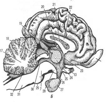 Головний мозок (encephalon) — це передній відділ центральної нервової системи, що міститься в мозковій порожнині черепа (черепній коробці). В ньому знаходять нервові центри вищої нервової діяльності, які здійснюють регуляцію найважливіших фізіологічних процесів і координують діяльність усіх систем організму (Мал. 2). Мал. 2. Головний мозок великої рогатої худоби: А — з базальної поверхні; Б — у сагітальному розрізі; 1 — нюхова цибулина; 2 — медіальна нюхова звивина; З — латеральна нюхова звивина; 4 — зоровий тракт; 5 — сірий горб; 6 — отвір лійки гіпофіза; 7 — ніжки великого мозку; 8 — соскоподібне тіло; 9 — мозковий, або вароліїв, міст; 10 — трапецієподібне тіло; 11 — довгастий мозок; 12-нюховий трикутник; 13-перехрестя зорових нервів; 14- грушоподібна частка; 15-піраміди; 16 — серединна борозна довгастого мозку; а — нюхові нитки; б — зоровий, в — окоруховий, г — блоковий, д — трійчастий, Є-відвідний, є-лицьовий, ж-слуховий, з- язикоглотковий, и- блукаючий, і-додатковий і і'- під'язиковий нерви; 17 — мозочок; 18 — чотиригорбкове тіло; 19 — епіфіз; 20 — склепіння; 21 — прозора перегородка; 22 — середина мозолистого тіла; 23 — передня спайка; 24 — порожнина третього мозкового шлуночка; 25 — проміжна маса зорових горбів; 26 — лійка; 27 — гіпофіз; 28 — соскоподібне тіло; 29 — мозковий міст; ЗО — мозковий водопровід; 31 — довгастий мозок; 32 — порожнина четвертого шлуночка.