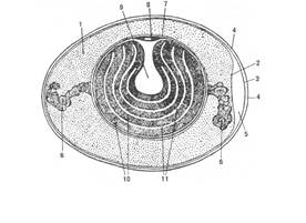 Мал.3. Яйцепровід курки: 1 — яєчник з фолікулами; 2 — оболонка фолікула; 3 — лійка яйцепроводу; 4 — білкова частина яйцепроводу; 5 — перешийок; 6 — шкаралупова частина; 7 — вихідна частина; 8 — клоака; 9 — пряма кишка; 10 — брижа із судинами Матка - це мішкоподібне розширення яйцепроводу, де яйце перебуває 19—20 годин. Тут за рахунок секреції залоз слизової оболонки утворюється шкаралупа яйця і відбувається подальший розвиток зародка — утворюється бластула, а потім гаструла. Після утворення шкаралупи в деяких птахів на її поверхні відкладається пігмент у вигляді плям, смуг і квіток, що надає яйцю певного забарвлення. Мал.4. Розріз курячого яйця: 1 — білкова оболонка; 2, 3 — внутрішній і зовнішній шари шкаралупової оболонки; 4 — вапняна шкаралупа; 5 — повітряна камера; 6 — градина; 7 — жовткова оболонка; 8 — зародковий диск; 9,11— білий жовток; 10 — жовтий жовток