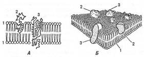 Мал. Модель клітинної мембрани: А — поперечний зріз; В — тримірне зображення; 1 — фосфолі-піди; 2 — білок, частково заглиблений у фосфоліпідний шар; 3 — білок, який пронизує обидва фосфоліпідні шари