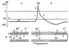 Мал.. Схема потенціалів спокою (А) і дії (Б) та механізми їх виникнення (В): мВ — мілівольти; єк — поріг збудливості; ПС — потенціал спокою; ПД — потенціал дії; 1 — деполяризація (зменшення ПС під впливом подразника); 2 — перезаряджання мембрани; 3 — відновлення початкового заряду; а — мембрана; б — цитоплазма. Прямі стрілки показують напрям йонів К+ і Na+ в бік їхньої найменшої концентрації; стрілки з кружечками — йонний натрій-калієвий насос. У цитоплазмі клітини міститься багато йонів калію, а в міжклітинній рідині його мало, тому і— він дифундує в міжклітинну рідину. Аніони не можуть проникати крізь мембрану і залишаються в клітині. У зв'язку з тим, що йони калію мають позитивний заряд, а аніони — негативний, то зовнішня поверхня мембрани заряджається позитивно, а внутрішня — негативно. У цитоплазмі клітини міститься багато йонів калію, а в міжклітинній рідині його мало, тому він дифундує в міжклітинну рідину. Аніони не можуть проникати крізь мембрану і залишаються в клітині. У зв'язку з тим, що йони калію мають позитивний заряд, а аніони — негативний, то зовнішня поверхня мембрани заряджається позитивно, а внутрішня — негативно. Проте клітинна мембрана меншою мірою проникна також для йонів натрію. Цих йонів у міжклітинній рідині більше, ніж у клітині, і вони в значній кількості дифундують у клітину, дещо зменшуючи заряд, який створюється калієм. Різниця концентрацій йонів калію і натрію в клітині і в міжклітинній рідині підтримує так званий йонний "натрієво-калієвий насос". Він здійснює переміщення йонів натрію в міжклітинну рідину, а йонів калію в клітину з допомогою спеціальних молекул-переносників. Внаслідок таких процесів клітина зберігає високу концентрацію йонів калію, а міжклітинна рідина — йонів натрію. Джерелом енергії для роботи "натрій-калієвого насоса" є АТФ. Потенціал дії. Усі клітини збудливих тканин при дії різних подразників достатньої сили здатні переходити в стан збудження. Під впливом подразнення проникність клітинної мембрани для йонів натрію підвищується в сотні разів. Оскільки в міжклітинній рідині йонів натрію більше, ніж у клітині, то вони швидко спрямовуються в клітину і здійснюється перезаряджання клітинної мембрани: внутрішній її бік заряджається позитивно, а зовнішній — негативно. Потім значно підвищується проникність мембрани для йонів калію, вони починають швидко переміщуватися з клітин у міжклітинну рідину, і знову відновлюється початковий заряд мембрани. Пікоподібне коливання потенціалу, що виникає внаслідок нетривалого перезаряджання мембрани і наступного відновлення її початкового заряду, називають потенціалом дії. Таке коливання потенціалу триває 1— 5 мілісекунд. Величина потенціалу дії нерва й скелетного м'яза становить 115—120 мВ. Отже, потенціал дії виникає внаслідок проходження йонних потоків крізь клітинну мембрану: рух йонів натрію всередину клітини спричинює перезаряджання мембрани, а вихід з клітини йонів калію відновлює початковий потенціал спокою. Проведення збудження. Потенціал дії, виникнувши в одній ділянці нервової клітини, нервового або м'язового волокна, швидко поширюється по всій їх поверхні. Поширення потенціалу дії здійснюється внаслідок формування так званих локальних, або колових, струмів. Усередині клітини струм рухається від збудженої ділянки до ділян